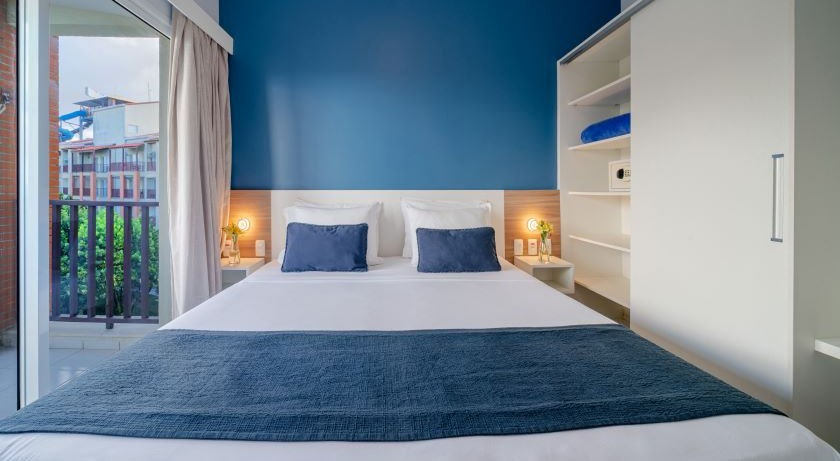 Os 53m² acomodam com bastante conforto até 3 adultos. O apartamento possui quarto com 01 cama king, saleta com 01 sofá-cama, mini copa, 01 banheiro e varanda, além de frigobar, microondas, TV a cabo, ar condicionado no quarto e na sala, cofre, chuveiro elétrico e secador de cabelo. Serviço de quarto 24 horas. •Não garantimos a localização e vista dos apartamentos