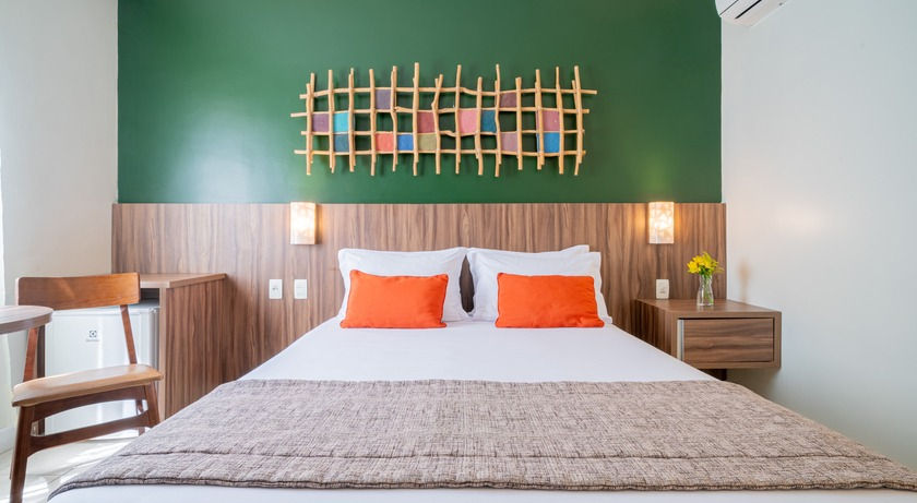Os 36m² acomodam com bastante conforto até 5 pessoas. O apartamento possui 01 quarto com 01 cama queen, 01 quarto com 02 ou 03 camas solteiro, 02 banheiros, além de frigobar, TV, ar condicionado nos quartos, cofre, chuveiro elétrico e secador de cabelo. Serviço de quarto 24 horas.